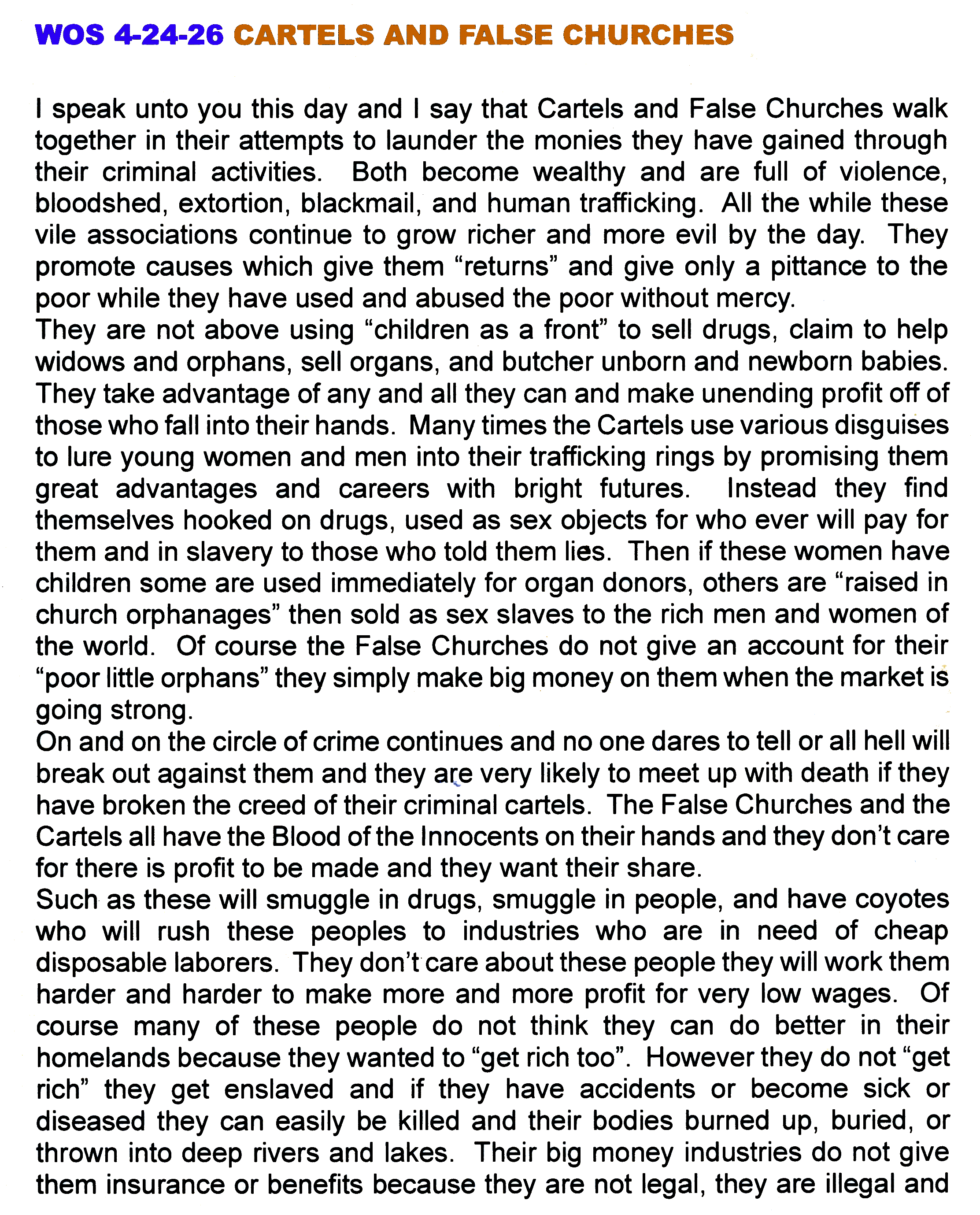 The Cartels By: Gen. Jim - 2/6/25 If you look up “Cartels” on the internet (Youtube) you’ll find titles like: Cartels, Cartels fire at Border (VSA), Cartels in Mexico Now, Cartels vs Trump, Cartels using Drones, Cartels Threaten ICE, Cartels Response, Cartels Doc., Cartels at War, Cartels in the U.S., Cartels 2025, Cartels 2024, Cartels in Texas etc. Does America have a “Cartel” problem? The U.S. doesn’t know how many Cartel members are in the U.S. One can only guess. Since Biden/Harris had an “open border” policy the past 4 years, no one knows for sure how many of these murderous members crossed over into the U.S.... with their drugs, sex/slave trades & EVIL intents. Since Donald Trump became America’s 47th POTUS he has declared the Mexican Cartels “Terrorist Organizations.” This has given the U.S. the legal authority to use whatever means necessary to COMBAT them – and Trump is BIG MAD! He is justified too, for the drugs that (China) supplies Mexico with have killed multiplied thousands of Americans each year. That’s right, THOUSANDS!!! While commies Biden/Harris et al. told the American people that our southern (and northern) border was SECURE! They LIED like two DEMONS! Taking it Personal Deborah & I take all this U.S./Mexico personally. During the 1970s we worked as Missionaries down in Mexico. During our 5 years in a Pentecostal Church Organization, we were their Mexico Missionaries. We loved Mexico. We had 2 very small children at that time who lived at a Church-owned missionary compound, an orphanage that had 80 children, mostly Indian. Our main task was to move it to another location eventually. Before we lived among them, we made 5 trips to the location deep into the mountains. There was this large lake just below our compound (it sat atop a mountain) where in times past the Indians sacrificed their children to crocs in the lake. Our compound was primitive. During our trips to Mexico City (where our H.Q. Church was located) we taught at their training school & once-in-awhile we preached at their large church. Deborah (from Sacramento, CA.) majored in Spanish in college. She was really good in the Spanish language. After we left the organization in 1977, we made a missions trip all the way thru Central Americal & passed into Columbia & Venezuela (see our “The Necks of Our Enemies” publication, photos included). So, to be clear, this article is not about racism - “we hate Mexicans!” -because we don’t! - it is about the evil cartels that hold Mexico hostage!!! Trump no doubt will deal with these cartels in a military manner. I don’t think the U.S. is anti-Mexico, it is anti-cartels. It is anti-drug lords. Trump’s new border Czar is Tom Homan, a true American that loves America & cares for the Mexican people that are, as said, held HOSTAGE by BAD people. While cartels have made WAR on America (via drugs etc.), making Billions $$, it is also a sad fact that Americans and others have supplied the cartels with weapons, arming & funding them. Bad actors on our side too! We’ve said it for years & years, there would be no cartels if the U.S. wasn’t addicted to drugs! I know you may not want to drink this bitter cup of truth, but if we were to STOP using drugs, the cartels would DRY UP! And, if Mexico would STOP getting fentanyl from China (& other drug related stuff), both Mexico & the U.S. (and the world in general) would & could be good neighbors. Now, it appears that a WAR between Mexico & the U.S. will begin... as Communist China smiles with glee over this. It is estimated that the Sinaloa Cartel alone, has 100,000 members. Well, really NO MATCH for what America can (and will) bring to the battlefield. We personally hate to see this because we have a love for the people of Mexico – yes, we’ve even witnessed to some of these “evil” persons. Our attitude is, let Trump do what needs to be done to eliminate the evil from the land of Mexico/America. Personally, I believe we should close the northern/southern borders to these people who want to live off the tax-paying citizens, do harm to the citizens at our cost. This is NOT FAIR. But the Biden/Harris regime was partners in crime. They, I believe, should be tried for treason! There is NO WAY to win this drug war without a fight. No way! It’s going to cost both Mexico & the U.S. The Narcos are not going to stop what they are doing – making Billions $$$ - they have to be STOPPED. While they have kamikaze drones, the U.S. military has weapons that the cartels do not want to mess with. It is a sad FACT that the Mexican government is basically run by these bad actors. When we worked there, there was a fair share of corruption, but tiny in comparison to now. It is hard to determine WHO & WHO is NOT working for the cartels. Cartel brutality & Mexican officials are at war, Mexico knows that the cartels basically control the officials. We spent 6 years working with Mexicans when we lived in Berino, N.M. (which was only miles from El Paso, TX. We had no problems. We saw thousands of “wet backs”, as they were called working the fields. We knew some of them, prayed for/with them. The Border Patrol would pass by often, but few arrests were made (this was in the 1990s). We have cried out against the drug problem since 1971. We’re told about America’s opioid crisis over & over, year after year, but it still grows. Addicts need drugs; hence, drug suppliers/dealers. Even if & when America goes to WAR with the cartels, we still have the “drug” problem here in the U.S. The Church is supposed to help with this problem. Well, sorry to inform you, the U.S. Church itself is one HELL of a MESS. It is in a “crisis” mode with wokeism, thereby making it spiritually weak & worthless. It needs a spiritual awakening, a spiritual revolution. The pews are full of drug users, sex perverts, and every other vile thing that STINKS up the atmosphere. If the leaders are not money-loving perverts, they are