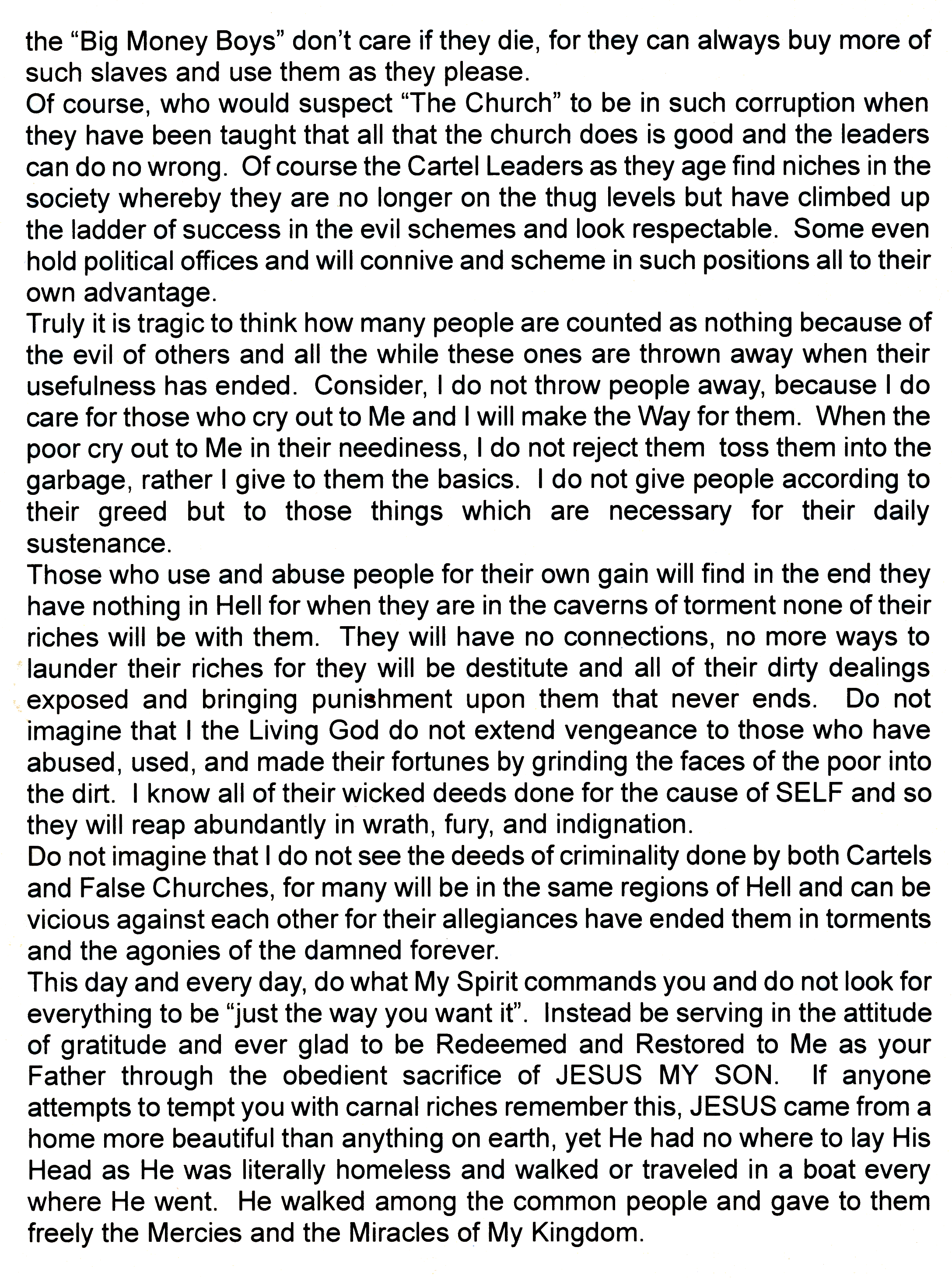 This has plainly happened in America a land where My principles and standards were once recognized and accepted as the guidelines to walk by. Since there have been for a long time local, state, and national leaders who shunned all semblance of moral integrity, deterioration has set in. Now it is common place for assassination to take place with no justifiable cause other than demonic imagination and fascination with murder. Then those who have allowed lunatic demons to take them over give way to such and do acts of atrocity which are blood curdling. If you really stop and consider why this is, the reason is simple, when people go a whoring after other gods, they will find themselves consumed with the desire to destroy others as they are being destroyed. Over and over, people who were innocent were murdered in cold blood in these assassinations and lives were taken instantly by individuals with insanity. How could things have deteriorated so far? It is easy for when rot sets in, it spreads until there are countless found dead. When there are individuals of great wealth and acclaim who are promoting the elimination of human lives by many means under the guise of “population control”. They use various slogans to cover up their murderous schemes and plots of full-scale murder which drive people of weak minds to decide to do their share for the cause. Then individuals are murdered by these people with insanity issues. Abortion of unborn and even murder of new born infants are promoted as justifiable inasmuch as women have the rights to their own bodies. However such women fail to realize that infants have a right to life and to their own bodies too. Such abominations are committed because people have come under the spell of the gods of the heathen and are acting out the atrocities which are involved in the worship of idols. Stop and consider when any people are worshiping idols, they are dumb and they love it so because their hearts are as hard and unfeeling as the idols they serve. They take no consideration for the wicked things which they commit because they are involved in worship to dead gods and there are no standards of righteousness to be found in the same. Superstition rules and violence, revenge, rape, thievery, and murder are common place and literally generations are ruled by such darkness. When so-called civilized nations invite to themselves, such abominations as are committed in idolatrous nations they cannot expect the invaders to leave their gods behind. No they bring their false gods and the wickedness of their ways with them and establish their rights to worship and commit crimes against humanity as a part of their “belief systems”. Then if the “civilized” nations have departed from Me, they become a breeding ground for the imagination, fascination, with assassination and the elimination of others by murder. Some have slogans which they think cover over their motivations of murder. However these ones are fools for I know the intents of the hearts of all men and women and I hold them accountable for the blood on their hands. When rich men believe themselves to be gods and able to dictate and determine who lives and who dies be aware, I know that they to have allowed the deceitfulness of their riches to cause them to be insane too. When I the Living God do warn against the deceitfulness of riches there is good reason. Those who are trusting in carnal wealth and believing themselves to be able to buy anything and everything their evil hearts imagine are destined to be damned. Literally there are world-wide agendas thought up by wealthy tycoons who are possessed of demons and they gather together to scheme and plot further ways of infecting people with the desire to destroy. Of course they are the bosses over the drug cartels which are assumed to be so powerful, yet these cartels are owned by these “rich men of this world”. So on the higher levels the cartel rulers know they are ruled. Governments become a facade and allow further invasion of demonic powers as all over the world there are epidemics of murder under many different disguises. However I the Living God do hear the cries and the prayers of those who are walking in integrity with Me. Therefore I am able to put into the hearts of leaders the desire to see righteousness restored. Nonetheless the devil and his demons do not want to lose their strongholds and so they demand those who are their dupes to “take drastic action” causing havoc. In the midst of all of the perversity, diversity, and insanity, wars erupt over nothing and generations are literally murdered for no cause. Proud, demon driven leaders must prove they are the greatest. Keep clear, keep clean, and seek the Holy Spirit Mind to guide you in the safety, security, and sanity which I give to those who are in fidelity of relationship with Me.